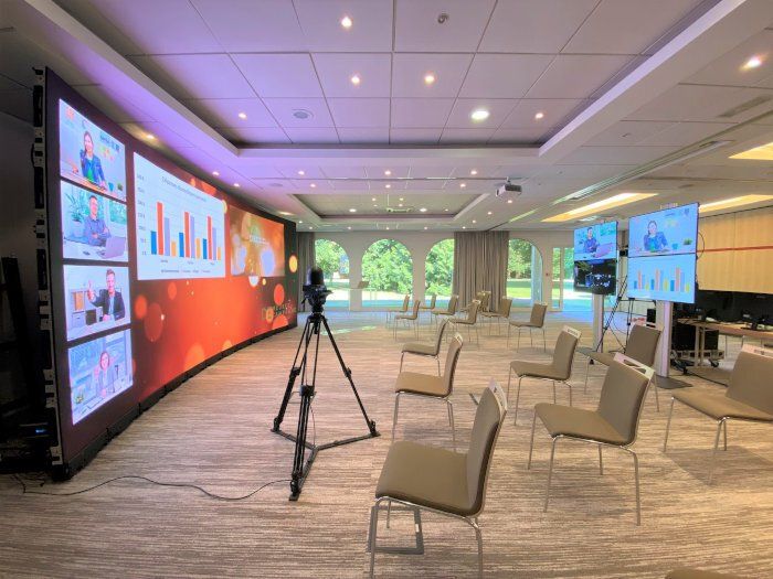 propose son studio TV high tech et modulable. Espace de 90m² doté d'une régie séparée se prête bien aux webinaires, multiplex et autres événements digitaux. Une prestation all inclusive qui s'adapte à vos besoins et inclut un matériel de pointe (son, vidéo, lumière) ainsi qu'un chef de projet dédié et des techniciens expérimentés.