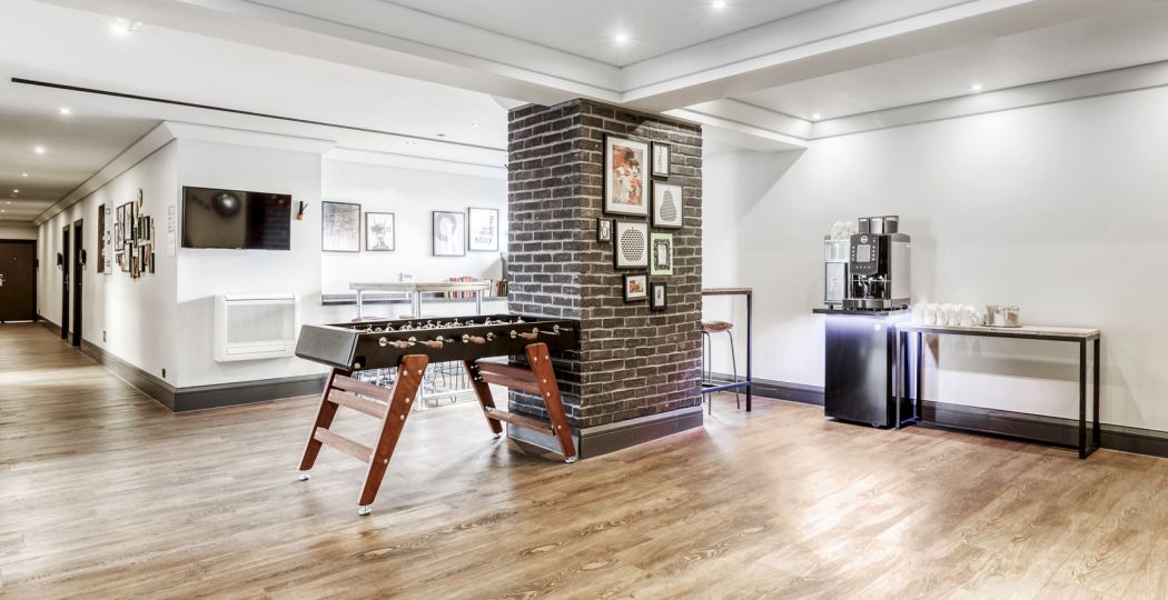 Faites votre check-in à la réception/bar (nouveau concept) en commandant une boisson, profitez de la retransmission des matchs de football dans le grand Pentalounge seul ou dans un espace réservé et jouez au flipper ou au baby-foot dans l’une des suites.